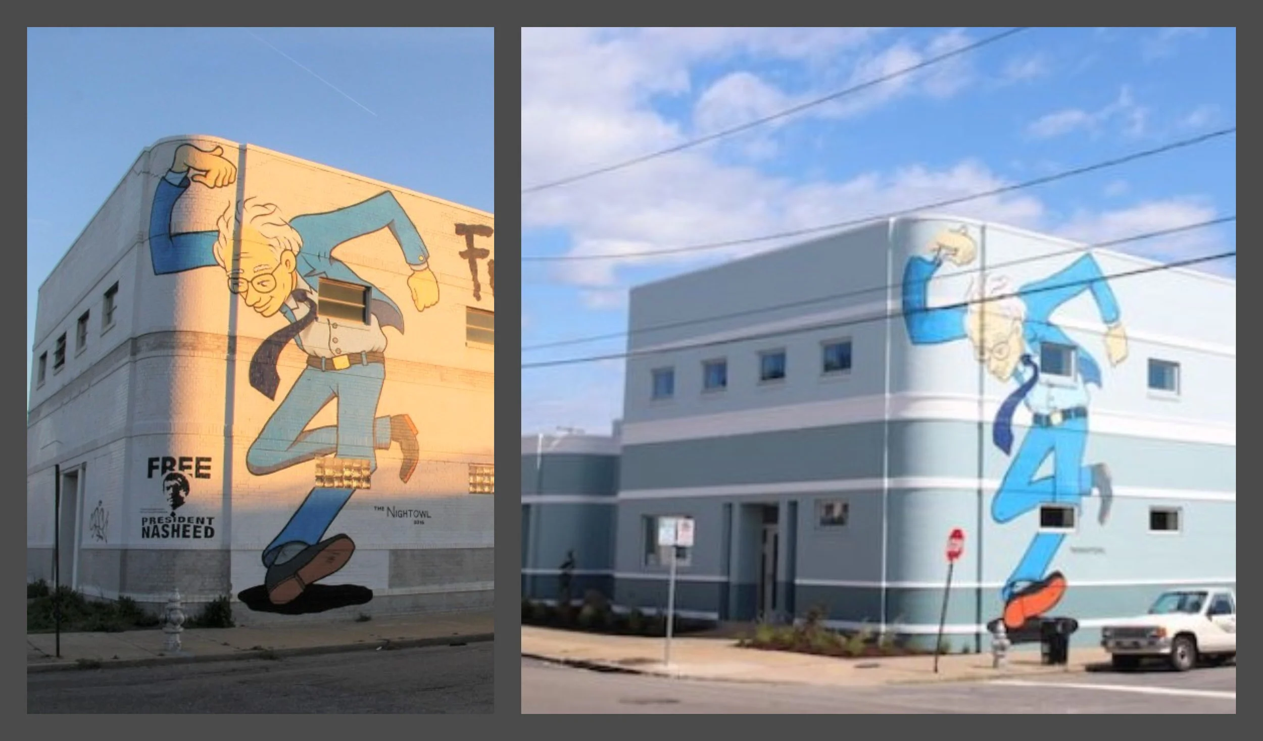 Client: The Highpoint on Broad Location: Scott's Addition in Richmond VAThis project involved a comprehensive restoration of a building's exterior and its prominent street-facing mural. The work transformed the building from its original light beige color to a vibrant new color scheme, dominated by a light blue-green/teal. The central mural, depicting a running figure, was meticulously restored to revive and enhance its original colors, resulting in a significantly brighter and more visually appealing piece of public art. The restoration successfully revitalized the building's aesthetic, creating a clean, modern, and engaging facade.